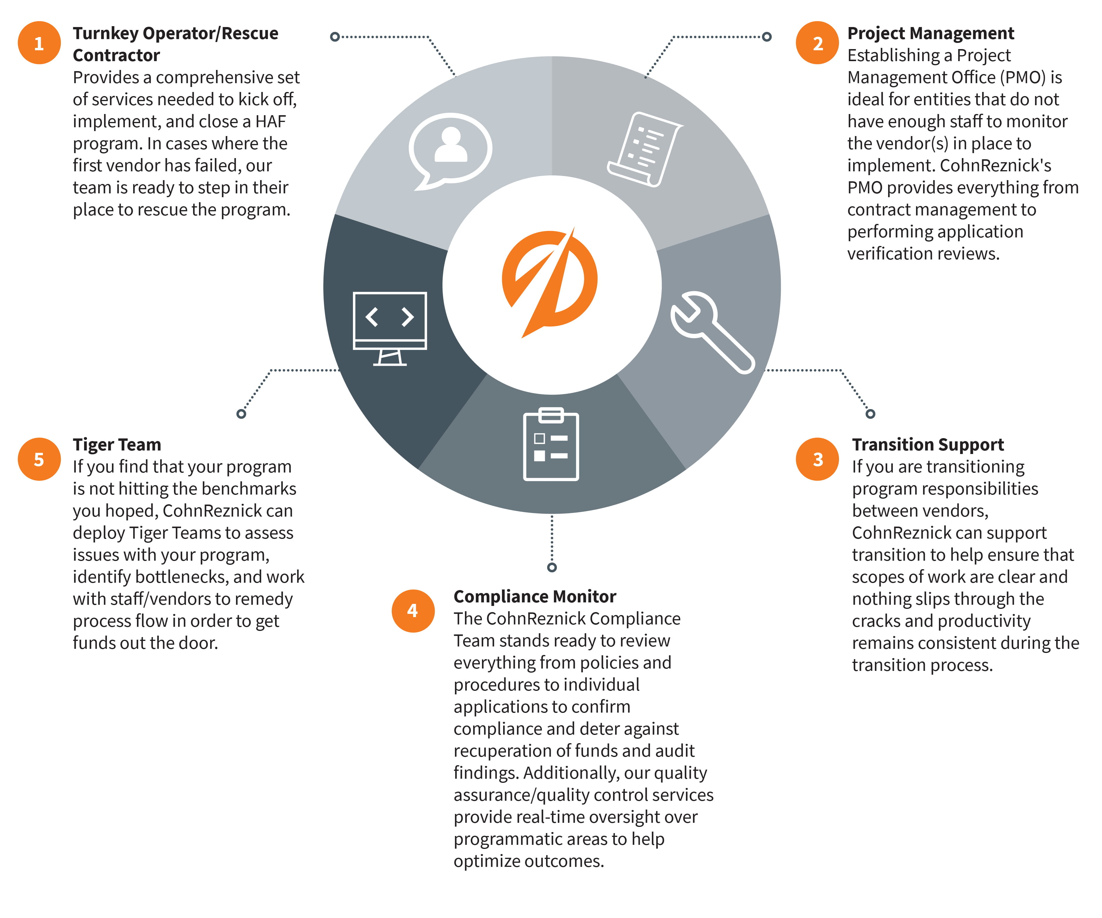Speed is paramount in administering HAF payments. Agencies must accept and verify applications quickly and speed payments to expedite relief to homeowners. CohnReznick has the experienced team, proven oversight processes, and scalable technologies to stand up our HAF project management office and establish a homeowner relief program within 30 days to help your communities recover. Our experienced team offers a turnkey approach to delivering HAF assistance to communities across the country.